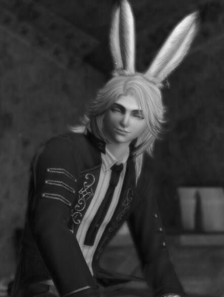 Are you seeking a partner in your hunt? The man before you is not one to barter his skills for gil alone. No, his price is far more— he trades in whispers, in secrets, in the knowledge you are willing to share. Gil, of course, never hurts, but it is the weight of your information that holds his attention, that makes him lean in just a little closer, like a predator scenting the air. He is a mercenary with a peculiar code—he is not drawn to bloodshed for its own sake, but he is willing to take on any job, even those that do not end in violence. His indifference to the suffering of others is as sharp as a blade, but there is a certain tenderness in the way he caters to those who find themselves drowning in their own grief or despair.But be warned—do not ask for his help if you are not prepared to pay the toll. For his price is steep, and his methods... well, his methods can be as ruthless as they are effective.You may see his rabbit ears twitch, delicate and sharp, attuned to the promise of words, to the subtle vibrations of a deal unfolding. If it is information you seek, if it is answers you require, he is more than willing to spill blood to uncover the truth. But know this: you must pay him well, and you must speak clearly—there are no vague promises, no half-formed requests here. If you are willing to meet his price, to offer up your payment in full, then he will do as promised, and he will do so with the same cold precision with which he handles his blade.